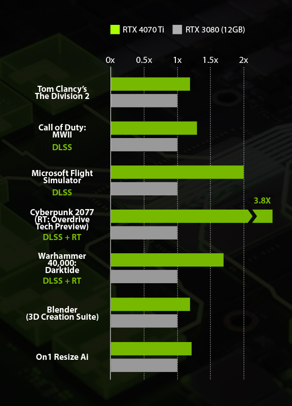 Get equipped for stellar gaming and creating with the NVIDIA® GeForce RTX™ 4070 Ti. It’s built with the ultra-efficient NVIDIA Ada Lovelace architecture. Experience fast ray tracing, AI-accelerated performance with DLSS 3, new ways to create, and much more.